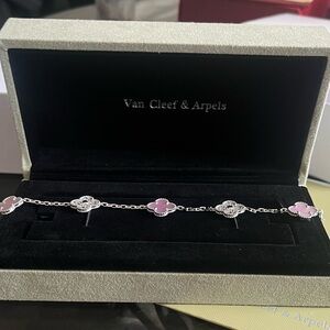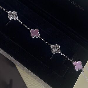 Chic bracelet with pink clover motifs and silver detailing. Ideal for a stylish touch.