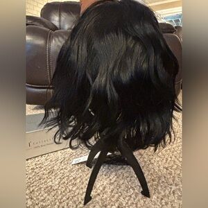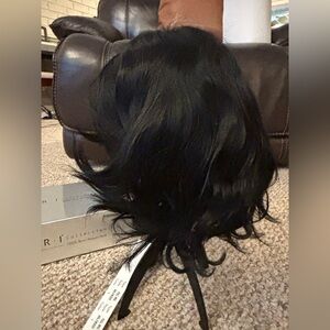 Natural-looking black short layered wig with soft side-swept bangs. Lightweight design for comfortable all-day wear. Easy to style for casual and dressy looks. Smooth, glossy black finish that blends with outfits.