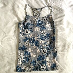 Lightweight women's camisole from Aeropostale with blue floral print. Features thin straps and a decorative crisscross back for a flirty look. Soft fabric offers comfortable, all-day wear. Perfect layered or worn alone for casual outfits. Super snatching/tight fit!!!