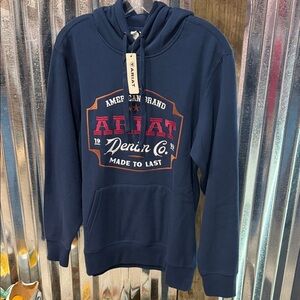 Ariat pullover hoodie in navy. Bold red and orange chest graphic with branded text. Kangaroo pocket and drawstring hood. Comfortable, everyday style.