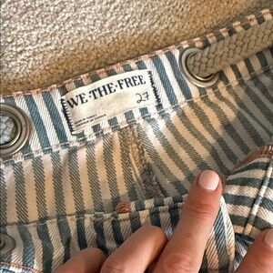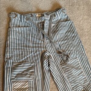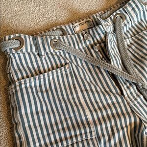 Lightweight striped pants with a relaxed silhouette. Features drawstring waist and grommet accents. Classic vertical blue and white stripe pattern. Versatile casual style.