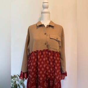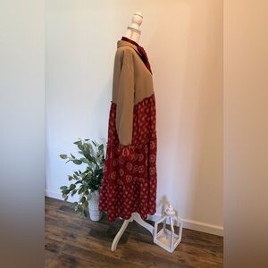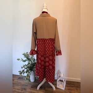 Beautiful tan and terra cotta tiered midi dress. Perfect for all seasons. The material is lightweight and flowy. Top is collared, has functional buttons and is accented with a real pocket. The sleeves are long with a ruffled cuff. This dress has a high low hem. Fits sizes small to large depending on how flowy you would like it to fit. Pictured on a size small mannequin for reference. Always refer to measurements listed below!
