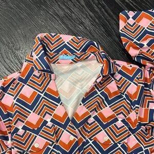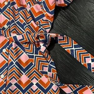 Elevate your style with this chic geometric long sleeve dress. Featuring a vibrant pattern in shades of pink, orange, and blue, this dress is perfect for any occasion. Enjoy the comfort and elegance it brings to your wardrobe.