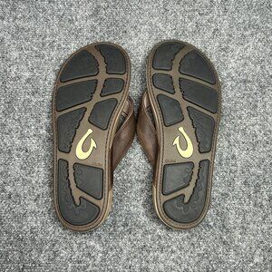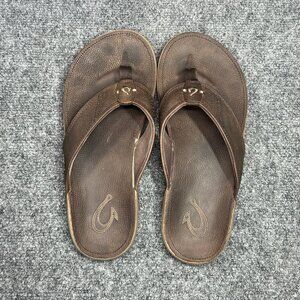 OluKai NUI flip flops men's brown leather outdoor beach thong sandals in gently used condition!