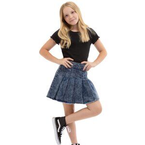Made in a stretch denim fabric for the right amount of comfort and will pair well with any top she chooses. Constructed in a unique acid wash with a 'cheerleader' pleated skirt silhouette.