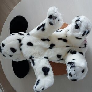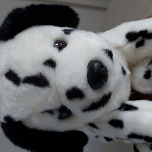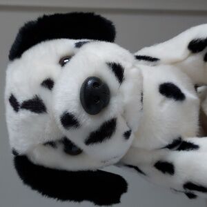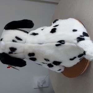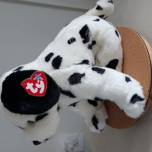 From my daughter's grand collection of TY Beanie Babies & Beanie Meet Dotty. This cuddly and super soft dalmatian was introduced in 1999. Measuring from the tip of the tail to the tip of the nose is about 13". From the top of the head to the bottom of the feet (in a standing position) is about 9". Dotty is your classic dalmation with white body and black spots and black ears and black eyes and a black nose. The bottoms of her paws are white except for --- you guessed it -- one black dot! Dotty is retired now and is in very good condition. Clean, smoke free home.