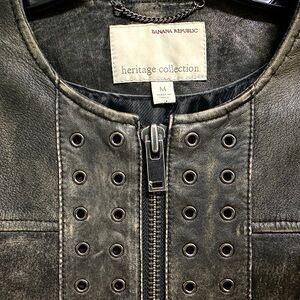 Banana Republic leather jacket with grommet detailing down the front. Front zip closure and flap pockets for utility. Soft, textured leather with clean, tailored lines. Versatile piece that layers easily. Lightly worn.