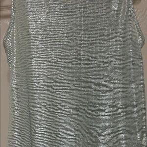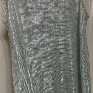Sleeveless tank with subtle metallic shimmer. Relaxed, easy silhouette. Lightweight fabric for layering or solo wear. Fresh mint tone with a refined shine and interesting subtle texture. Such a fun top for going out! This girl might just want to dance in the lights and shimmer for everyone. Probably NOT shy. ;-)