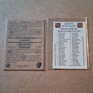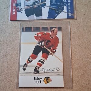 Two collectible hockey cards featuring Bobby Hull. Prominent Chicago Blackhawks red and black team colors. Clear player images and team logos. Great for collectors and display.