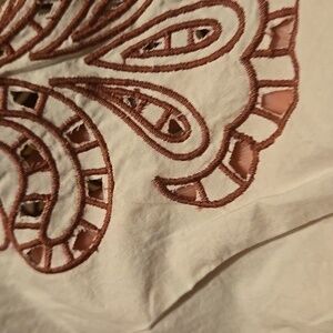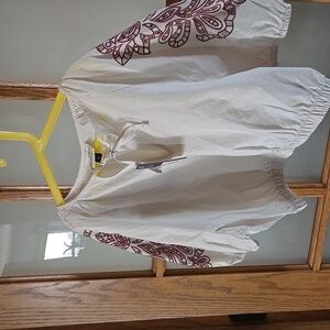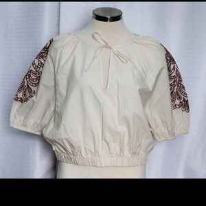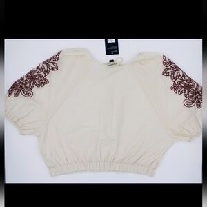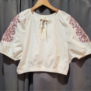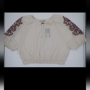 Beautiful cream color with maroon embroiderec balloon sleeves, elastic hem, and a feminine tie-front neckline formal hippie concert country glam bar going out