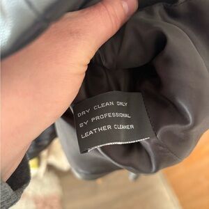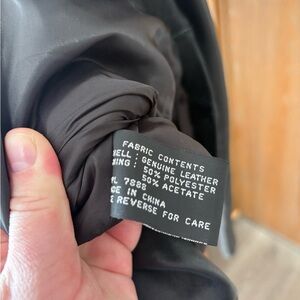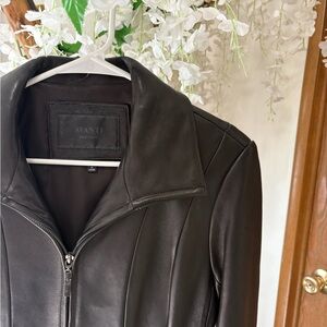 Tailored black leather jacket with a center zipper. Vertical seam paneling creates a structured fit. Classic fold collar adds refined style. Smooth leather for a clean, polished look.