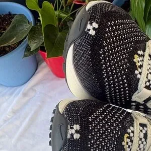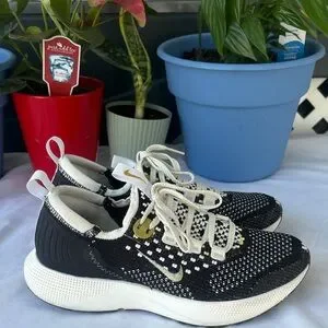 Nike knit sneakers with a black and cream patterned upper. Cream laces and eyelet loops. Small yellow swoosh and accent details. Breathable lightweight knit design.