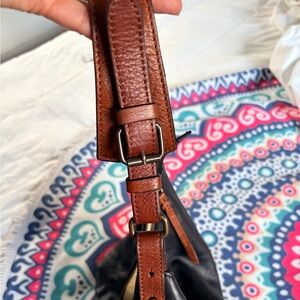 Sleek black leather shoulder bag with brown trim for a polished look. EUC, no flaws.