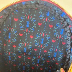 Adorable Frozen-themed Loungefly mini backpack inspired by Anna’s Scandinavian folk design. The front pocket features a cute Olaf zipper charm, and the back includes the gold script message “Follow your heart.”