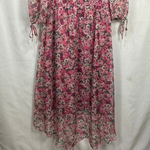 Off-the-shoulder midi dress features a vibrant pink floral print on a lightweight, semi-sheer chiffon-style fabric. Designed with an elasticized neckline and waist for a comfortable fit, it includes 3/4 length sleeves with delicate tie details at the cuffs. The high-low hemline adds a modern touch, while the full interior lining ensures coverage and a smooth drape.