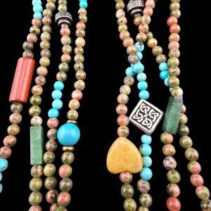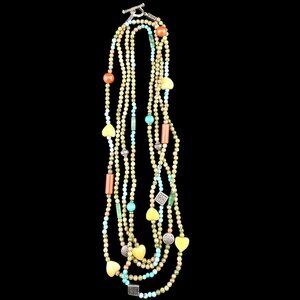 This multi-strand necklace features vibrant turquoise, yellow, and green beads with heart-shaped accents and detailed silver-tone charms. The toggle clasp ensures secure wear. Its eclectic, bohemian design makes it a distinctive accessory, ideal for layering or wearing as a statement piece. Artful craftsmanship is evident in every intricate detail.