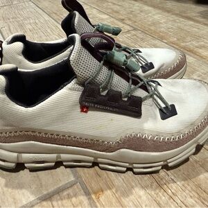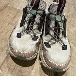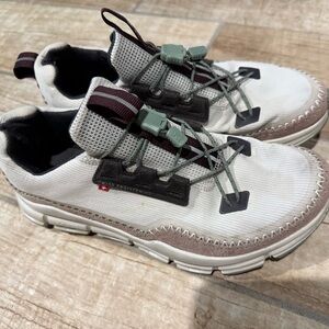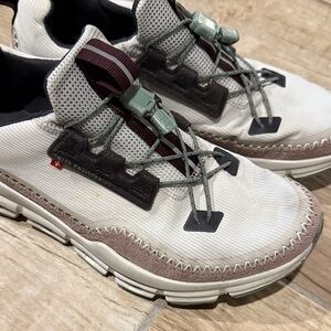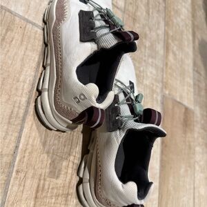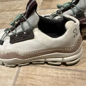 Stylish On Running shoes. Cream upper with brown accents. Comfortable and durable design.