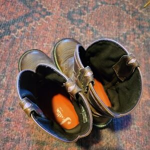 Stylish brown cowgirl western boots with pink embroidery. Justin boots, retail over $100, genuine leather. Has a flaw- one boot needs glued on one side. Otherwise in good condition, price reflects condition of the one side of the one boot that is flawed.