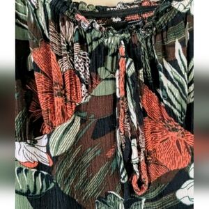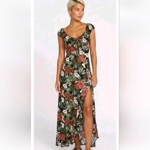 Volcom size M women's maxi dress is black with a tropical print and is perfect for summer nights. Designed in collaboration with the Hawaiian surfer Coco Ho. Features: sweetheart neckline, cap sleeves, high low detail with ruffle and slit on the left side, elastic and drawstring at neck, smocked back panel. Made of 100% viscose crinkle gauze. Color is black with large tropical flowers. Measurements are: 17 in armpit to armpit unstretched, 15 in across waist unstretched. First photo is a stock picture, this is a pre-owned item. Please feel free to ask any questions!