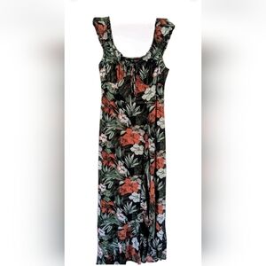 Volcom Women's M Tropical Black Floral Maxi Dress Front Slit Straps Stretch Back