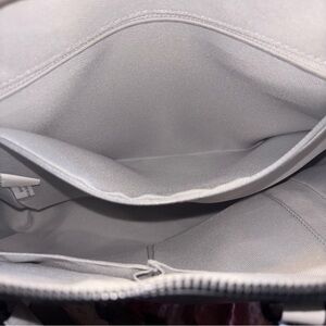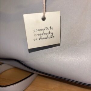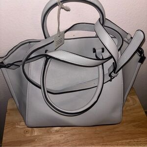A New Day light gray satchel designed for everyday versatility. Features dual top handles and a detachable shoulder strap for hands-free wear. Smooth exterior with subtle black-edge detailing for a refined finish. Neutral light gray complements casual and professional outfits.