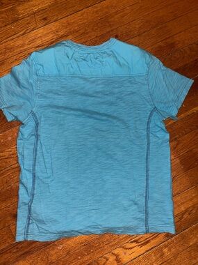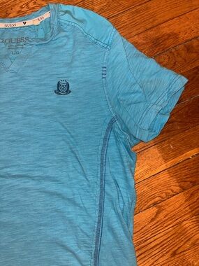 Guess short-sleeve Johnny collar tee in a fun teal/turquoise shade. Features contrast seam detailing and small embroidered crest on chest. Breathable 100% cotton fabric for daily wear. Simple, classic great with a pair of jeans or shorts. Minimally worn and in excellent condition
