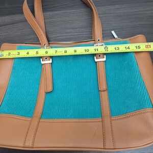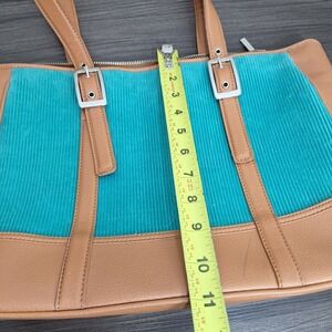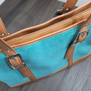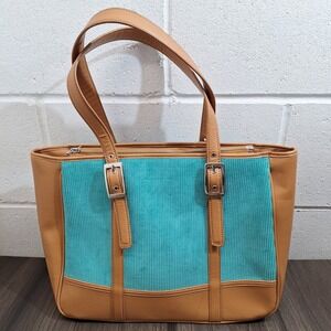 Bath & Body Works Teal Corduroy Tan Faux Leather Tote Shoulder Bag Buckle Accent