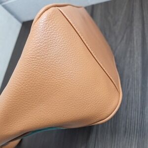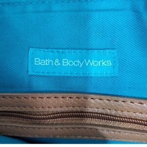 Bath & Body Works tote bag combines a textured teal corduroy front panel with a pebbled tan faux leather exterior for a vibrant, mixed-media look. This structured shoulder bag features silver-tone buckle accents on the straps and a secure top zipper closure that opens to a spacious teal-lined interior with an additional zippered pocket. The durable construction and pop of color make it a versatile choice for daily use or travel.