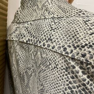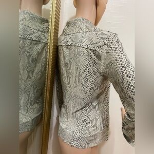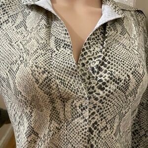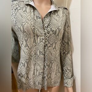 Sophisticated snake-print long-sleeve top in neutral tones. Soft, lightweight fabric with a classic collar and button-front styling. Flattering tailored fit that transitions easily from day to night. Neutral snake pattern adds a modern, versatile touch.