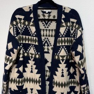 Excellent condition. Southwestern cardigan. Cozy open-front cardigan in a beige and navy Aztec pattern with pockets. Soft knit fabric with long sleeves and front pockets. Armpit to armpit is about 24 inches and 29 inches long. Versatile layering piece that adds warmth and style to everyday outfits. All items have been cleaned and cones from a smoke free home.