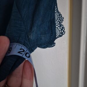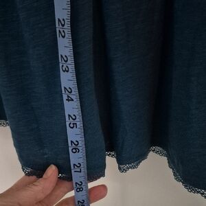 Teal blue short-sleeve top with a faux-wrap V-neck. Lace trim accents neckline, sleeves, and hem. Flowy babydoll waist adds a feminine touch. Lightweight knit for everyday wear. NWOT.