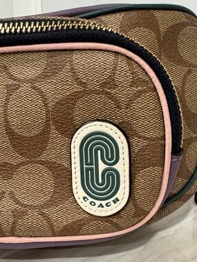 Coach logo patch on front. Classic brown signature canvas. Pink leather trim accents. Gold-tone hardware. Compact crossbody style. Versatile and chic.