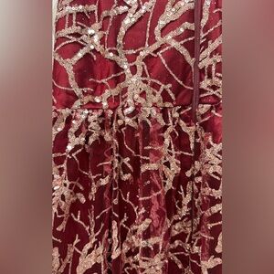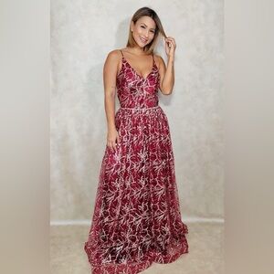 Stunning burgundy formal dress with intricate sequin and lace embroidery throughout. This elegant gown features a flattering V-neckline with delicate straps and a flowing midi-to-maxi length skirt.