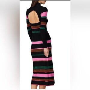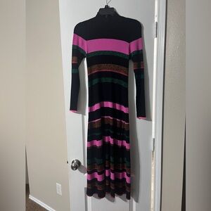 Elegant long sleeve dress with vibrant stripes. Features pink, black, and green hues. Perfect for stylish outings.