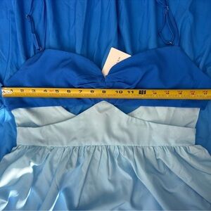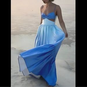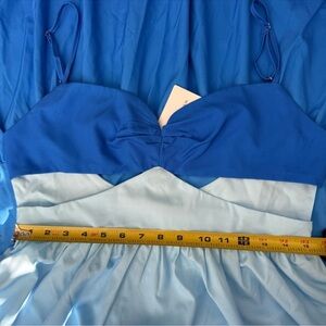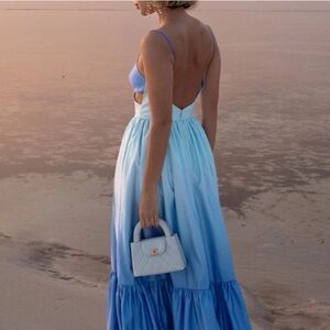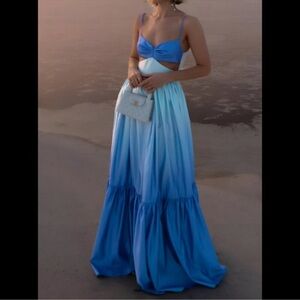 Get ready for summer with this gorgeous maxi dress from Commense Size Large NWT which features a zipper back, a sweetheart neckline with ruching, cutout design, an open back, and adjustable spaghetti straps. The maxi-length dress also has a flowing tiered skirt that has a blue ombre gradient effect. Pair with your favorite sandals. Dress has attached tags.