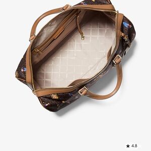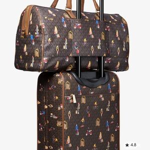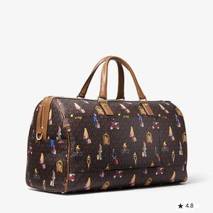 Michael Kors printed canvas duffel. Tan leather trim and handles. Adjustable shoulder strap for easy carry. Repeating playful travel-themed print.