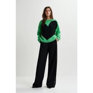 Women's sweater by ESSENTIEL ANTWERP. Size XS. Green with black heart intarsia print. Long sleeve, pullover. NWT new with tags. Wool/acrylic/polyamide.