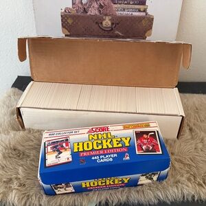 Discover the excitement of the NHL Hockey Premier Edition Card Set. Featuring a vibrant blue design, this set is perfect for hockey enthusiasts. And 1991 baseball cards box. This is open box not sure if they are complete. Over 10000 cards total