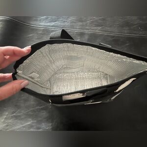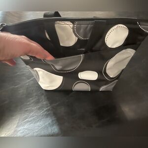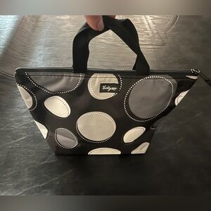 This is a Thirty-One lunch box tote. I only used a few times, in like new condition. 2 black handles, zipper enclosure & one large pocket on back side. Black bag with grey & white circle patterns.