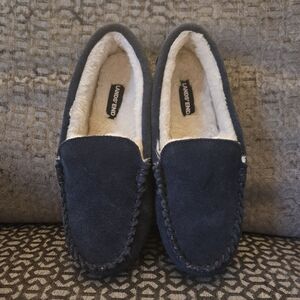 Cozy navy suede loafer slipper with plush lining. Ideal for comfort and warmth.