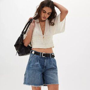Effortlessly airy, this breezy short-sleeved blouse features a lightweight cotton fabrication, a relaxed bust with a fitted, ruched bodice, and eyelet lace details for a touch of femme. Color is Clean Ivory. Size S. New spring Free People piece!