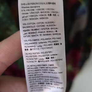 Material: 61% Viscose; 19% Polyester; 15% Polyamide; 3% Polyester; 2% Metallised Fibers