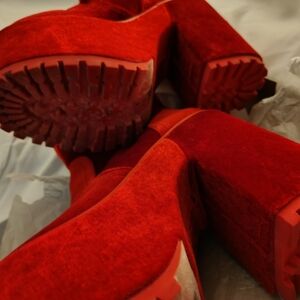 YRU Red Velvet Platform Block Heel Ankle Boots - Women
