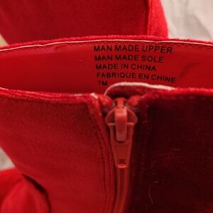 Stand out in these red velvet platform ankle boots. Featuring a bold block heel and chunky lug sole for confident traction. Soft velvet upper delivers a luxe look and comfortable fit. Perfect for evening wear or statement street style.