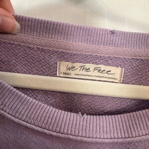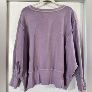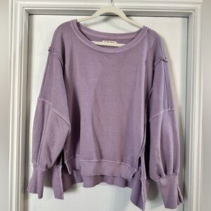 Casual washed pullover sweater in a soft lavender hue. Oversized fit with dropped shoulders and balloon sleeves. Raw-edge details and side slits add relaxed style. Comfortable everyday layering piece.
