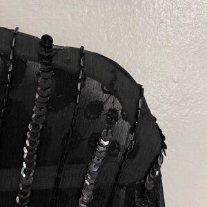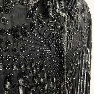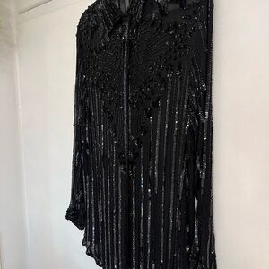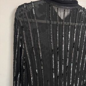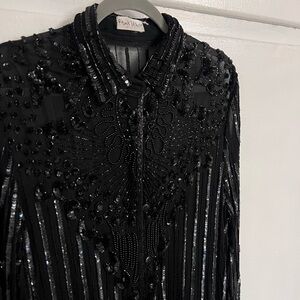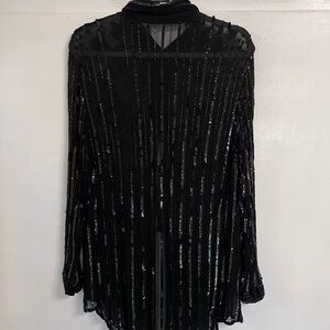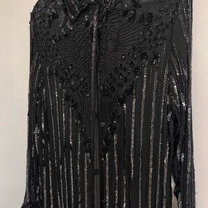 Sheer long-sleeve blouse with vertical sequin stripes. Intricate beadwork across the yoke and shoulders. Button-front closure with a subtle collar. Elegant and dressy for evening wear.