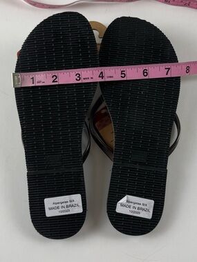 These Havaianas sandals are a stylish and classic choice for women in size US 7. The gray steel metallic graphite color adds a touch of sophistication, while the flat heel and slip-on closure make them comfortable for all-day wear. Made from durable rubber with a synthetic lining, these thong-style flip flops are perfect for casual outings, travel, and summer, fall, and spring seasons. The Havaianas logo accents add a trendy detail to these timeless sandals.