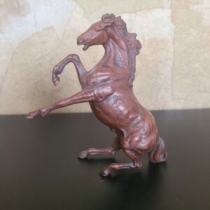 Vintage Hartland rearing horse figurine captures a dynamic sense of movement with its powerful, upright pose and detailed musculature. Crafted with a rich faux wood grain finish, this piece offers the aesthetic of carved timber with the durability of a molded material. The expressive face and flowing mane add a touch of wild elegance to any bookshelf, desk, or mantel. Protective pads on the base ensure it sits securely on various surfaces without scratching.
