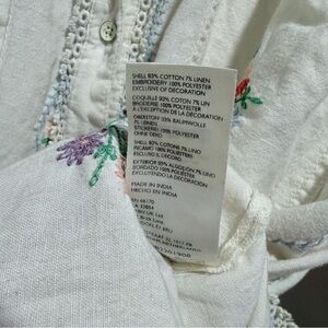 Features: Breezy cotton-linen blend, collared neckline, button-front closure, patch chest pockets, drop-shoulder short sleeves, floral embroidery, intricate trim