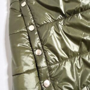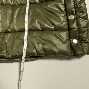 Stay warm and stylish in this stunning JustFab maxi puffer coat. This long-line jacket features a sleek, high-shine olive green finish with a flattering quilted pattern. It’s designed with both a zipper and snap-button closure for extra insulation, plus a matching quilted belt to cinch the waist for a structured silhouette.